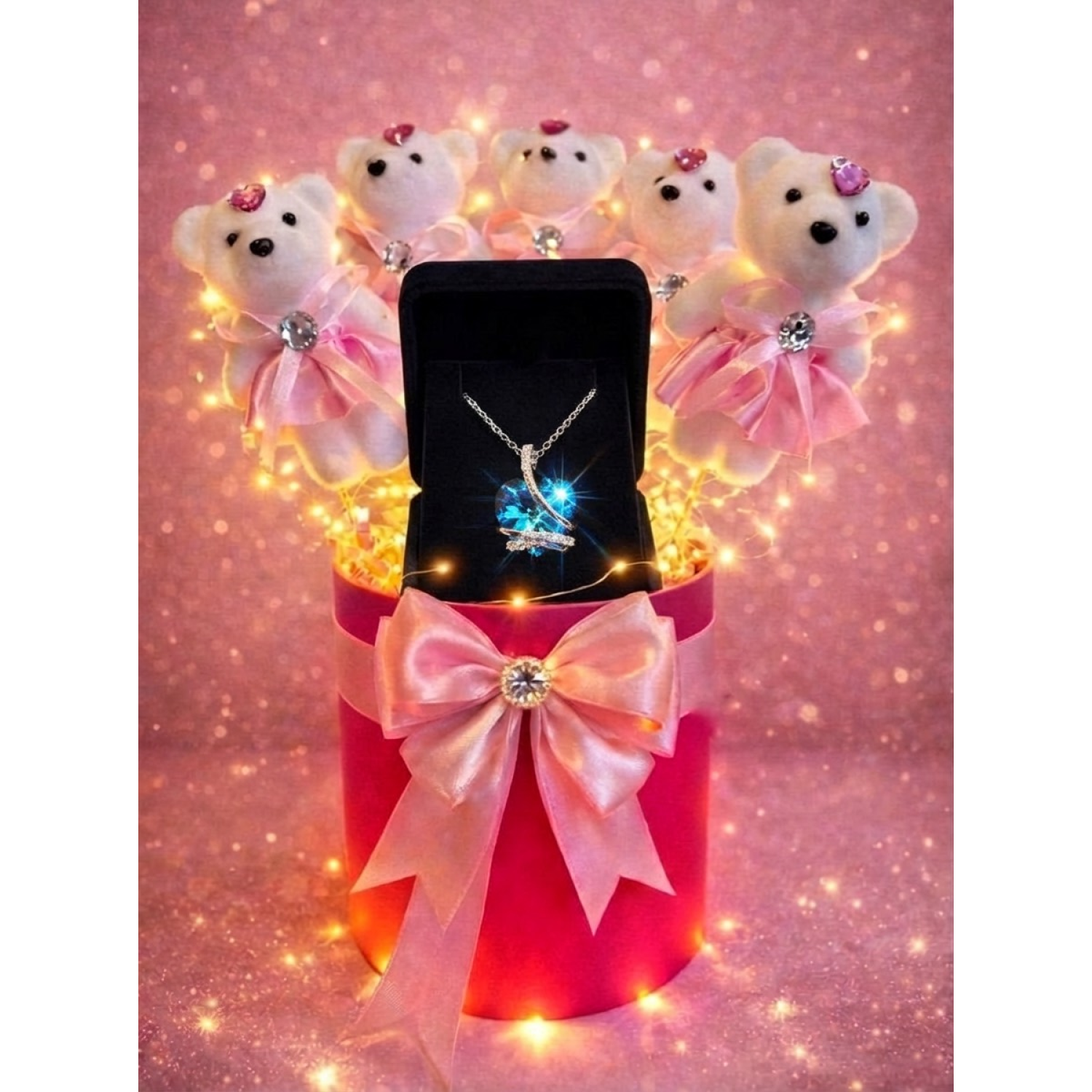 Fuşya renkli hediye kutusu içinde yer alan 5 beyaz mini ayıcık ve ortasında parlayan 1 pembe peluş ayıcık, etrafını saran sıcak tonlu led ışıklarla birlikte muhteşem bir görüntü oluşturuyor.